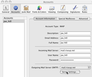 3. Both incoming and SMTP servers should both be “mail.riseup.net”.